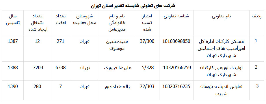 در نهایت از میان تعاونی های راه یافته به مرحله نهایی 3شرکت تعاونی به عنوان تعاونی برتر و 3 شرکت تعاونی به عنوان تعاونی شایسته تقدیر استان و 2 تعاونی بعنوان تعاونی شایسته تقدیر ملی به شرح جدول ذیل انتخاب گردید.