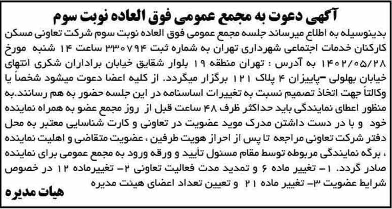 آگهی دعوت به مجمع عمومی بطور فوق العاده نوبت سوم